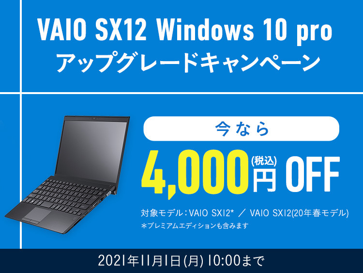 「Windows 10 Pro」へのアップグレードが4,000円(税込)OFF。(キャンペーン期間:2021年11月1日(月)10:00まで)